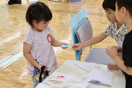 7月17日(水)、幼稚園のホールでお店屋さんごっこをしました。年長組の子どもたちが、ひこうきやさん、しゅりけんやさん、おもちゃ・にんぎょうやさん、ブレスレットやさん、ドレスやさん、おはなやさん、ジュースやさんの7つのお店を準備しました。