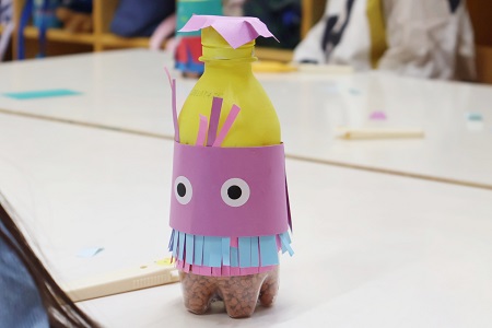 空のペットボトルにセラミスという土を入れるところからカシシ作りがスタート。ペットボトルの小さな入り口に、口の大きな紙コップに入ったセラミスをどうやってこぼさず入れるか、智力先生が子どもたちに問いかけました。「スプーンで入れる」「手で少しずつ入れる」「ペットボトルのキャップを使う」など色々なアイデアがでました。「どれも正解!今回は紙を使って入れてみよう」と智力先生。くるっと巻いた紙を漏斗として使い、こぼさず上手に入れることができました。「振ってみよう!楽器が完成したよ。楽器の飾りをつけてみよう」。智力先生のお手本のとおり、ペットボトルの上部に絵具で色を塗り、下部には色紙を巻き付けて、のりで貼りました。色紙にはハサミで切り込みを入れ、ひらひらとした洋服のような仕上がりに。いくつもの工程を集中しながら一つ一つ重ね、作品を作りました。白と黒のシールが配られ、智力先生から「好きなように貼っていいよ!」と声をかけられると丸いシールを目や口などに見立てて貼っていました。最後に小さな色画用紙を自分の好きな形に切って貼り、髪の毛・ほっぺ・口・まゆげなどの装飾を施し、素敵な作品が完成しました。