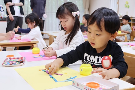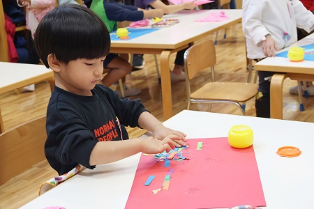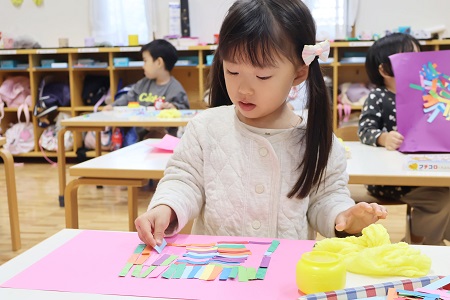 同じ形、同じサイズの色画用紙を使ってスタートした造形活動。完成した作品は一つ一つ全く違って子どもたちの個性が輝いていました。今回の造形活動でも、作品作りに熱中しながら楽しむ子どもたちの顔を見ることができました。