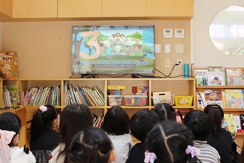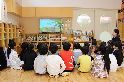 その後、7歳の主人公が登場する動画を教師と一緒に観ました。スマホやタブレットを使って写真を撮影したり、撮影した写真を加工したり、絵を描いたり、調べものをしたり、日本ではない国に住む動物を観ることができたり、遠くに住むおばあちゃんとお顔を見ながらコミュニケーションを取ったりと、動画の主人公がインターネットを使ってさまざまなことにチャレンジしている動画でした。その主人公から、交通ルールと同じようにインターネットを使う時も守るべき3つの約束があることも教えてもらいました。