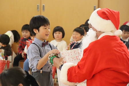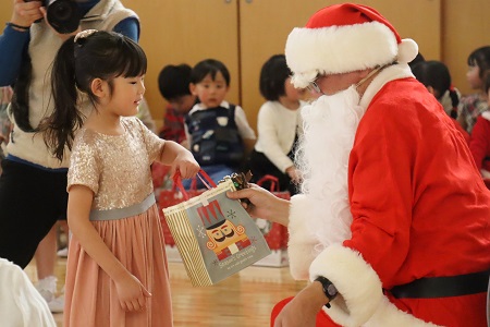 そこへ突然サンタさんが登場!子どもたちからは大歓声があがりました。楽しそうなクリスマス会の様子に誘われてやって来たサンタさんは、一人一人にクリスマスプレゼントを手渡してくれました。