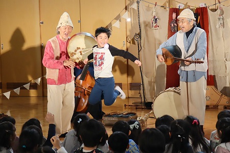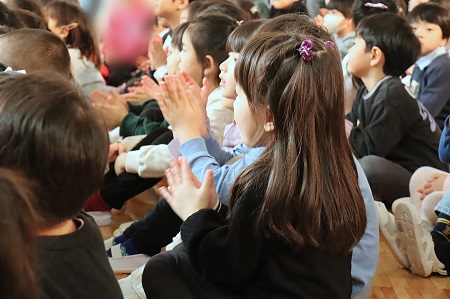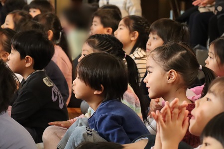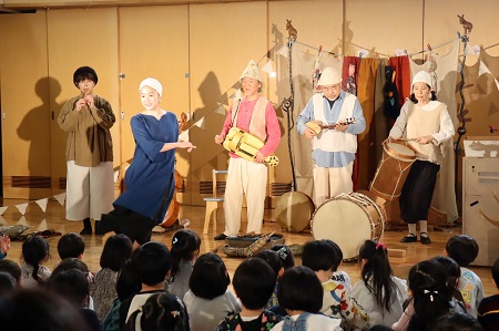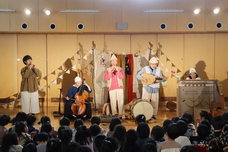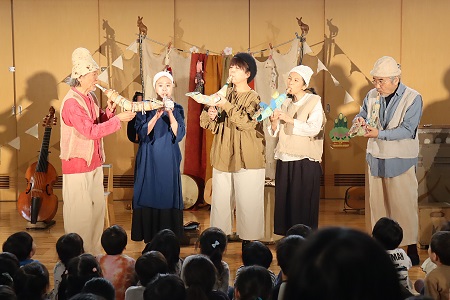 1月20日(月)、中世ルネサンス時代の古楽器や世界の民族楽器を使って演奏する「ロバの音楽座」の皆さんを幼稚園にお迎えして音楽鑑賞会を行いました。鈴の音色とともにロバの音楽座の皆さんがホールに登場。みんな拍手で迎えて演奏がスタートしました。「今は冬ですね、冬の自然の音楽に耳を澄ませてみましょう」。静まった会場で耳を澄ますと、優しい楽器の音色が聞こえてきました。ロバの音楽座の皆さんが作った空想楽器と呼ばれる変わった形や音のする楽器もたくさん登場しました。「ブーパク」という楽器は、まるで楽器同士がおしゃべりしているみたいに見ているだけで楽しい気持ちになる楽器。その他にも見た目から名付けられた「ヤマイモ」という楽器やハンドルを回しながら演奏する変わった形の「ハーディーガーディー」などの珍しい音色に耳を傾けました。演奏を聴くだけでなく、子どもたちが手拍子や歌で演奏に参加する場面もあり、ロバの音楽座の世界にたっぷり浸り、心地良い演奏に身をゆだねる素敵な時間を過ごしました。