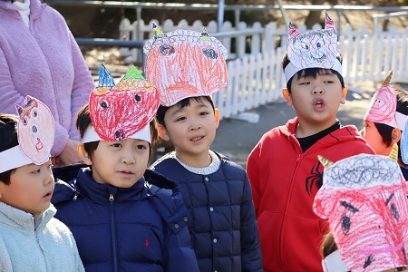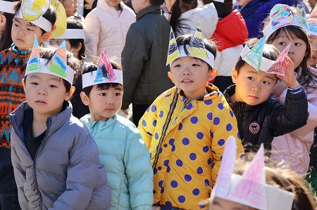 自分で作った鬼のお面をかぶって集まった子どもたち。「2月2日は節分、2月3日は立春です。悪いことや嫌なことにさようならをして、スッキリとした気持ちで春を迎えましょう。みんなはどんなことをスッキリさせたいかな?」。教師が問いかけると、寝坊しちゃう鬼、喧嘩しちゃう鬼、ゲームばかりしちゃう鬼…子どもたちの中の悪い鬼がたくさん挙げられました。「悪い鬼とさようならして、もっとかっこいいお兄さん、お姉さんになりましょう」。