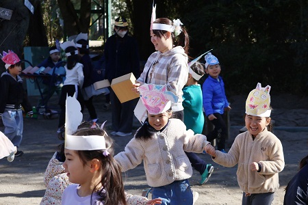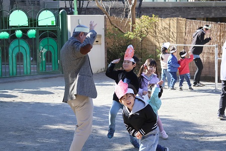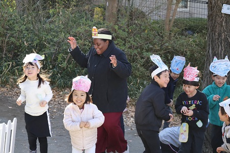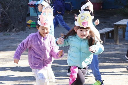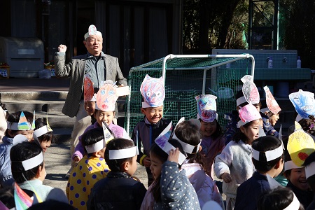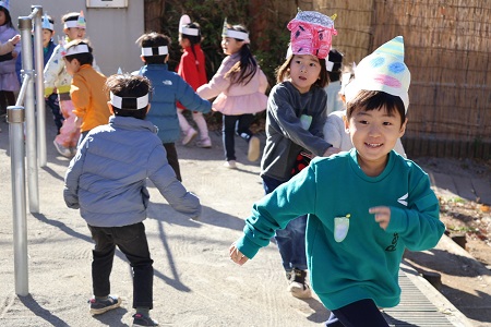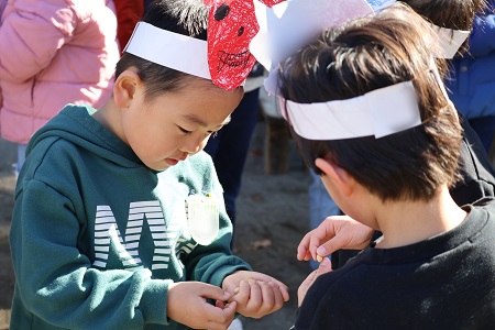 みんなで「豆まきの歌」を歌ったら、園長先生のご発声でついに豆まきの始まりです。初めは子どもたちが鬼役を、二回目は交代して教師が鬼役をおこないました。「鬼は外!」、「福はうち!」。鬼から逃げたり、豆をまいたり、子どもたちは元気いっぱいに園庭をかけまわりました。自分の中の悪い鬼を退治して、福を呼び込んだ子どもたち。笑顔が溢れた豆まきになりました。