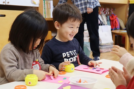 「今度は紙を貼り合わせてこの顔を立体にしてみよう」。折った部分を重ね合わせて、顔が立体的になるように糊で貼り付けました。「重ね合わせる幅によって顔の表情が変わっていくね。好きなところで貼ってみよう」と智力先生。先生に手伝っていただきながら、立体的な作品が完成しました。最後はみんなの作品同士をタワーのように積み重ねました。「お友達を増やすために作った作品。遊んでいて他のお友達の作品が壊れないように」。自分たちの作品に愛着を持つのと同じように、友達の作品も同じように大切にしながら一緒に遊ぶことを教えてもらいました。今回の造形活動では、平らな紙でも糊を使って立体にさせることができること、立体になった作品は立たせることができることを楽しみながら学びました。