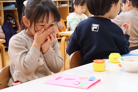 2月7日(金)、年少組が彫刻家の高橋智力先生による造形活動を行いました。今回は、細かく切った色紙を顔のさまざまなパーツに見立てて色画用紙に貼り付け、「顔」を作りました。