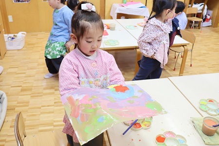 2月20日(木)に年中組が彫刻家の高橋智力先生による造形活動を行いました。今回は、はさみで切った色画用紙を白い画用紙に貼り付け、その上に絵の具で色をつけました。