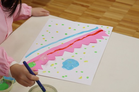 それぞれ好きな色の画用紙を選んだら、自由に2本の線を決めて紙の端から端を切っていきます。「バナナみたいな形になった!」「くす玉を割ったときの形に見える!」。はさみで切った形が何に見えるか、想像が膨らんでいきます。色画用紙が切れたら、のりを使って白い画用紙に貼り付けます。「紙のどこにのりを付けたら良いか考えながら貼ってみてね。紙がペラペラしているところはないかな」。子どもたちは智力先生のアドバイスを聞いて、慎重に紙を貼り付けていました。紙を貼り付けられたら、最後にパレットに出した絵の具と筆を使って色をつけました。「筆を水でよく濡らしてから使ってね。水をつけると絵の具が伸びるよ。水と絵の具を上手く混ぜて使ってみましょう」。