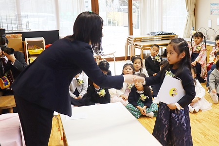とても晴れやかな表情で卒園証書を手にする卒園児たち
