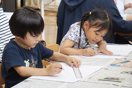 今回は「ボールペンの“ボール”ってどこにあるの?」「どうして色が出るの?」といった問いに触れ、実際に描く感触を体験しながら、ボールペンに親しんでいきました。古代から人々が使ってきた便利な道具「定規」の役割についても学び、「まっすぐな線を引く」だけでなく「線の長さを測る」という使い方も体験しました。造形活動を通して、作品を完成させるまでの過程を楽しみながら学び、個性あふれる素敵な作品がたくさん出来上がりました。