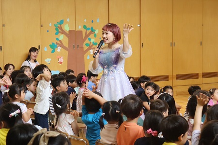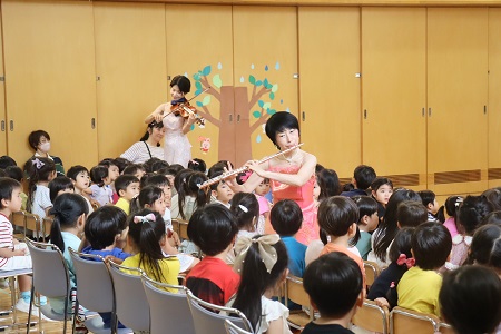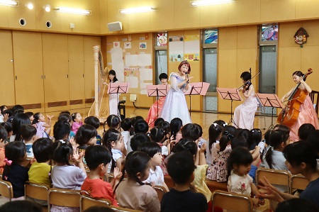 6月2日(月)、幼稚園でサマーコンサートを開催しました。今年はヴァイオリン、チェロ、ハープ、フルートの奏者とボーカルの5名の演奏家の皆さんを迎えて約1時間の音楽鑑賞会を行いました。