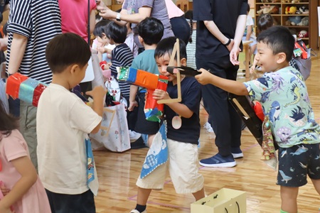 7月4日(金)にお店やさんごっこをしました。お花やさん、ドレスやさん、パソコンやさん、武器やさん、宝石やさん、絵やさんの6つのお店を年長組が開店しました。お客さんは年中組と年少組の子どもたちです。お買い物バッグと手作りのお金が入ったお財布を持って、買い物に来てくれました。「お店やさん開店します!いらっしゃいませー!」。年長組の元気な呼びかけでお店やさんごっこがスタート。「これください!」「お釣りです」「また来てください!」とお店やさんとお客さんがお互いに声をかけ合いながら、商品を売ったり買ったりする体験をしました。どのお店もお客さんで大賑わいです。すべてのお店の商品が見事に完売となりました。「全部売り切れたね、おめでとう!」。最後は年長組のみんなで拍手してお祝いしました。お客さんに声をかけて商品をたくさん買ってもらったり、代金を受け取ってお釣りを渡したり、買ってくれた商品を袋に詰めるのを手伝ったり、新しい体験をした高揚感や達成感、そして全商品が売れたホッとした気持ちで年長組のみんなに笑顔が広がりました。お店やさんごっこを通して、年長組と年中組・年少組が交流しながら楽しい時間を過ごしました。
