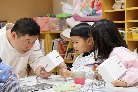 後半は、宙に浮いた四角い発泡スチロールとそこに刺した枝に、絵の具で色を塗っていきます。「混ぜるときは隣の友達と混ぜてもいいか相談して、一緒に絵の具を使ってね」。先生のアドバイスを聞いて、筆を使って慎重に丁寧に作品に色を塗っていきます。力強い作品や繊細な作品、子どもたちの個性が溢れる素敵な作品が完成しました。
