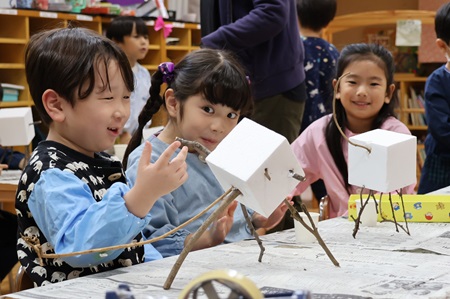 最初は枝選び。学園内を散歩しながら集めた枝の中から、5本ほど好きな枝を各自が選び、作品作りスタートです。1本ずつ丁寧に差し、1本増えるごとに宙に浮くか確認する作業を続けます。苦戦しながら何本も枝を使って、やっと発泡スチロールが宙に浮いた瞬間、パッと笑顔になる子どもたち。「立った!」「先生見て!」とあちこちから歓声が挙がりました。