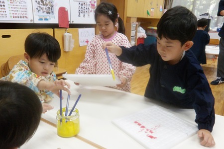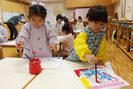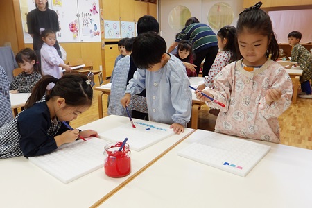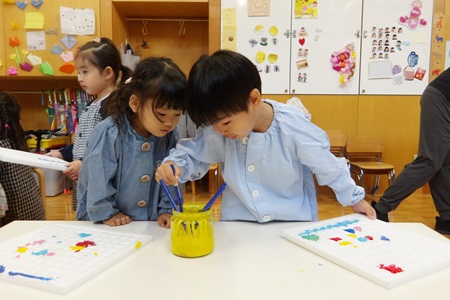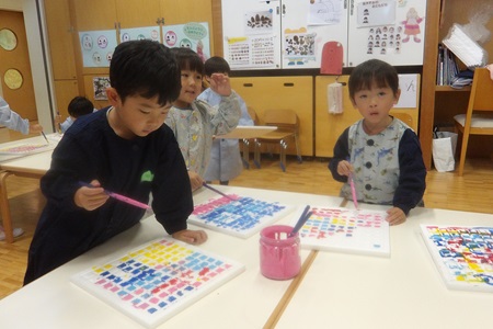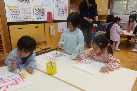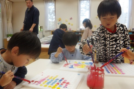 整然とした規則性の中で、自分のリズムや表現の仕方を見つけ出し、色や形に対する興味がのびやかに広がっていきます。