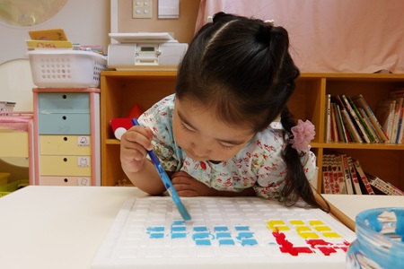 四角ひとつずつをリズムよく塗り分ける子、溝の線に沿って模様を描く子、