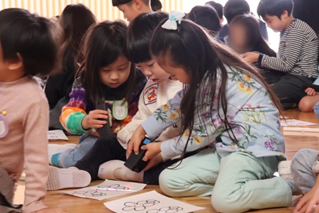 「ここは何色?」という問いかけに「ピンク!」と元気に答える子どもたち