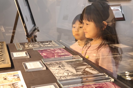 どんなものが展示されているのか、興味津々の様子で歴史記念館を訪れた子どもたち。教育研究所の荒垣恒明さん、池田浩貴さんが特別展示を分かりやすく説明してくれました。