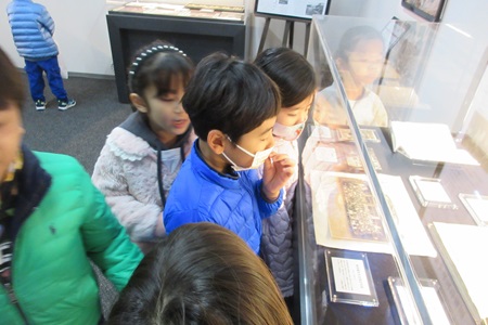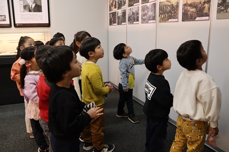 11月26日(水)に年長組、12月4日(木)に年少組、12月5日(金)に年中組が、学園内の施設「成城学園歴史記念館」の見学に行きました。歴史記念館は、学園の歴史、創立者澤柳政太郎の業績、学園の歴史を彩る文化人の事績、学園が開き一体となって発展してきた成城の街の歴史について、総合的に展示する施設です。歴史記念館では、幼稚園が今年で創立100周年を迎えたことを記念し、特別展示「ぼくら わたし 成城の子どもです —成城幼稚園の百年—」を開催しています。