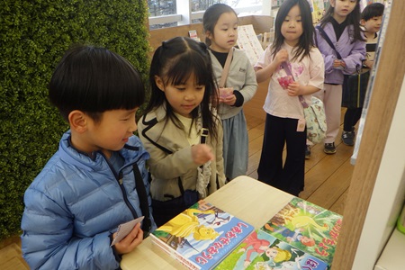 三省堂書店の店員の方々のご協力のもと、地域住民の皆さまに見守られながら、年長組の子どもたちは無事お買い物体験を終えることができました。子どもたちにとって、とても貴重な体験だったことと思います。
