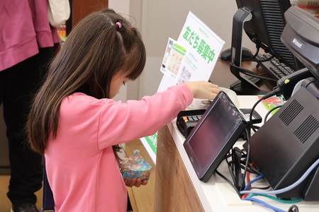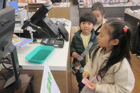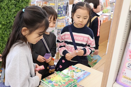 出発前に、保護者の方に用意していただいた代金を、幼稚園で作ったお財布に入れて準備しました。教師からそのお財布を受け取り、いよいよ店内へ。4種類ある絵本から、好きな本を1冊選んでレジへ持っていきます。少し緊張した様子で「お願いします」と店員の方に本を渡す子どもたち。そして、お財布からお金を出して店員さんに渡し、商品とレシートを受け取ったらお店の外へ。無事にお買い物ができて、嬉しそうな笑顔を見せていました。