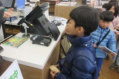 2月24日(火)と27日(金)の2班に分かれて、年長組がお買い物体験をしました。幼稚園では、お店の方との関わりの中で、社会とのつながりを感じ地域でお仕事をされている方々に親しみを持つこと、自分でお金を扱う感覚を持ち、自分で商品を選ぶという体験をすることを目的として、年長組がお買い物体験を行っています。今回も三省堂書店の方々にご協力いただき、子どもたちが自分で絵本を選び、お金を払って買う体験をしました。